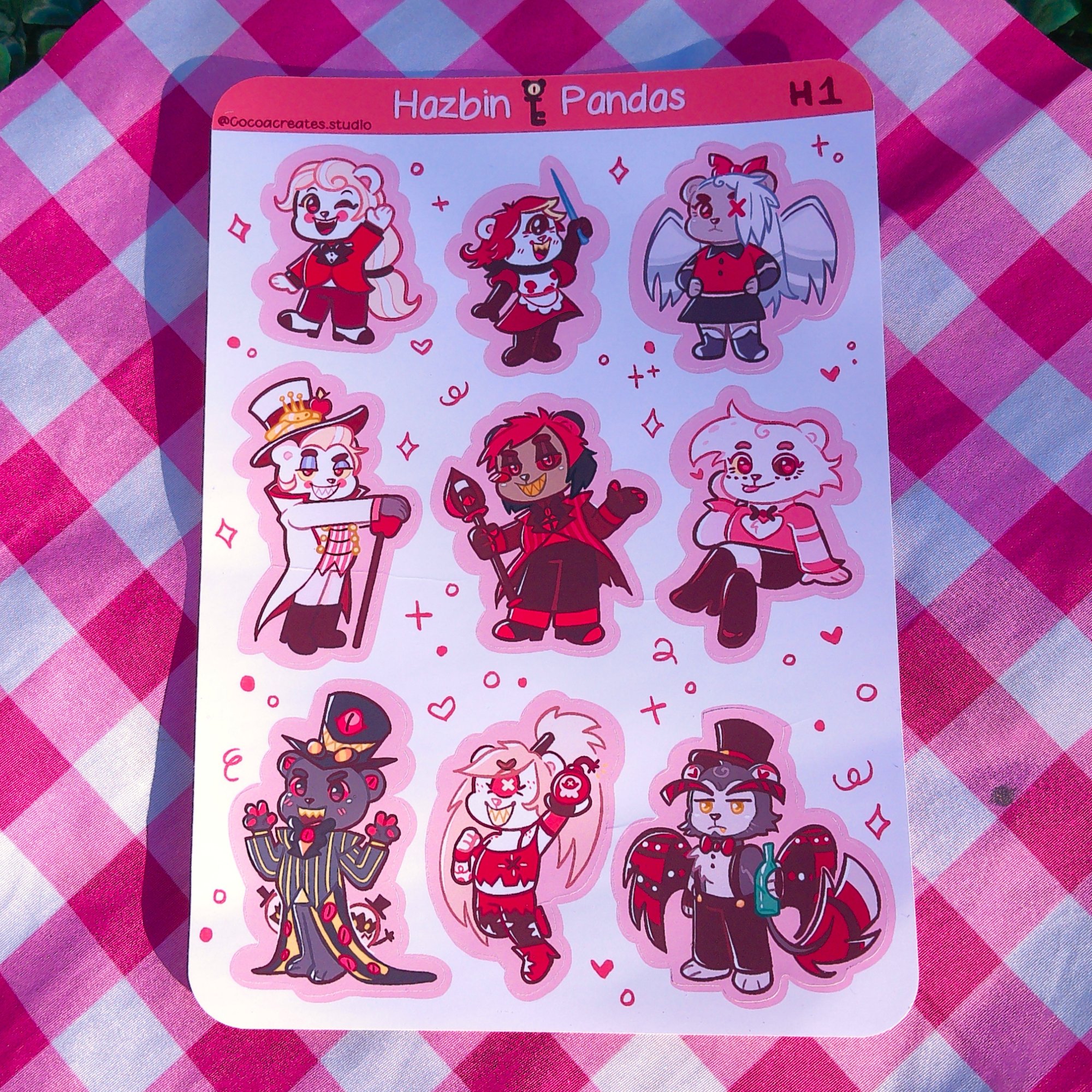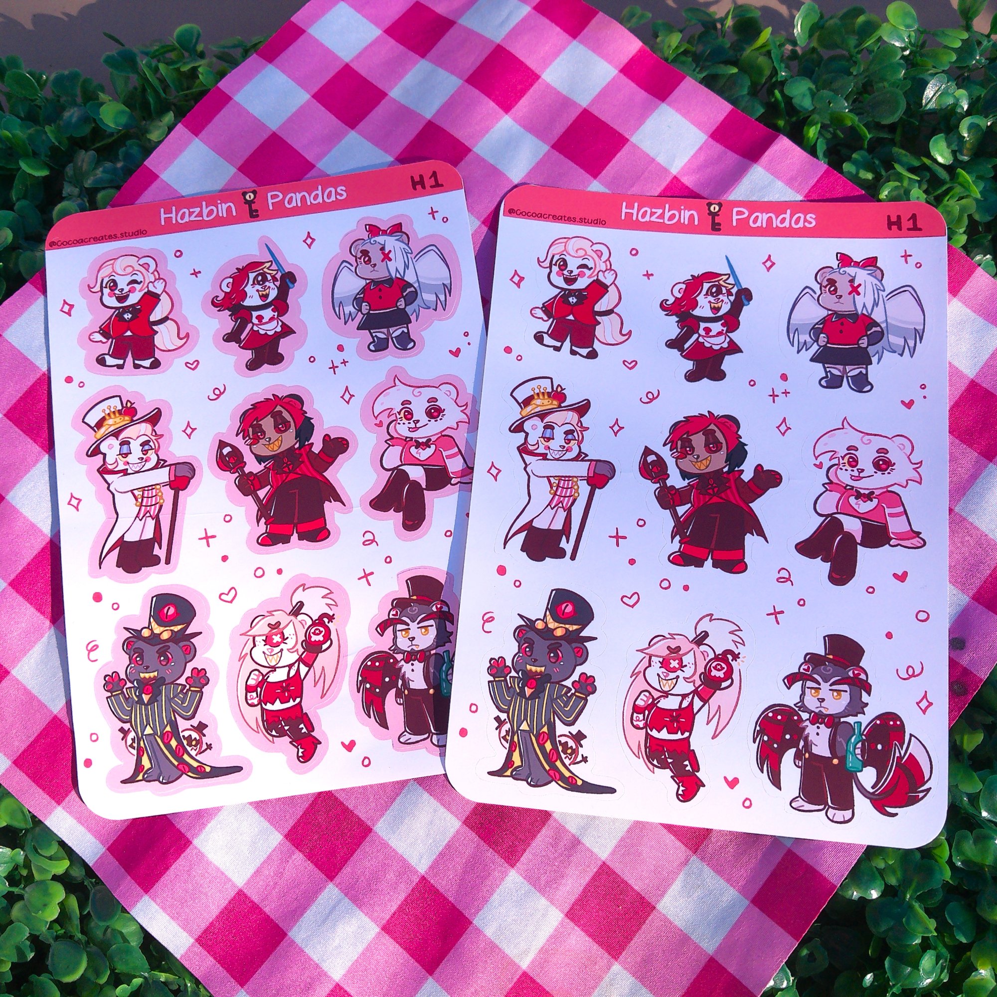 These little pandas are ready to seek out redemption! These stickers feature pandas inspired by some of the Hazbin characters. The Matte sticker sheet is NOT suited for surfaces that may get wet. These stickers are best applied to journals, laptops, or calendars.